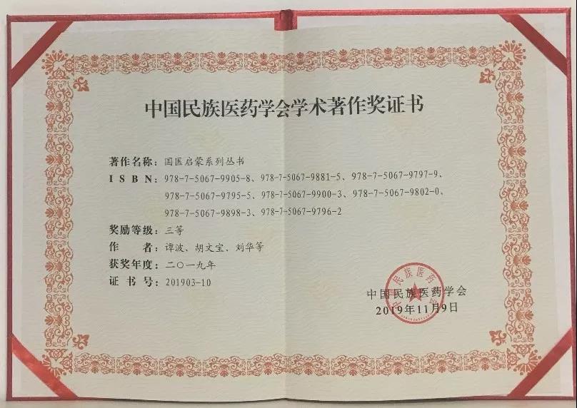 近日,在南京举行的2019年中国民族医药学会年会上,由谭波总主编的《国医启蒙系列丛书》获得中国民族医药学会学术著作奖三等奖。